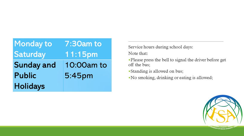 There is a total of 4 buses from UM-71, 72, 73 and N6 (night bus: 00:00-06:00). One bus ride is MOP 6, you can buy Macau Pass at a convenience store first, and you only need MOP 3 once to take the bus (Student Macau Pass can only be processed after school starts).